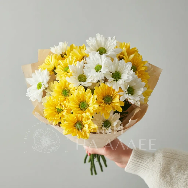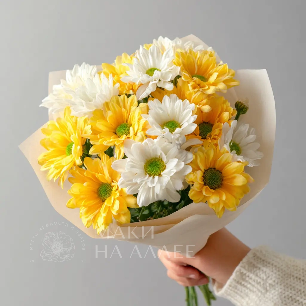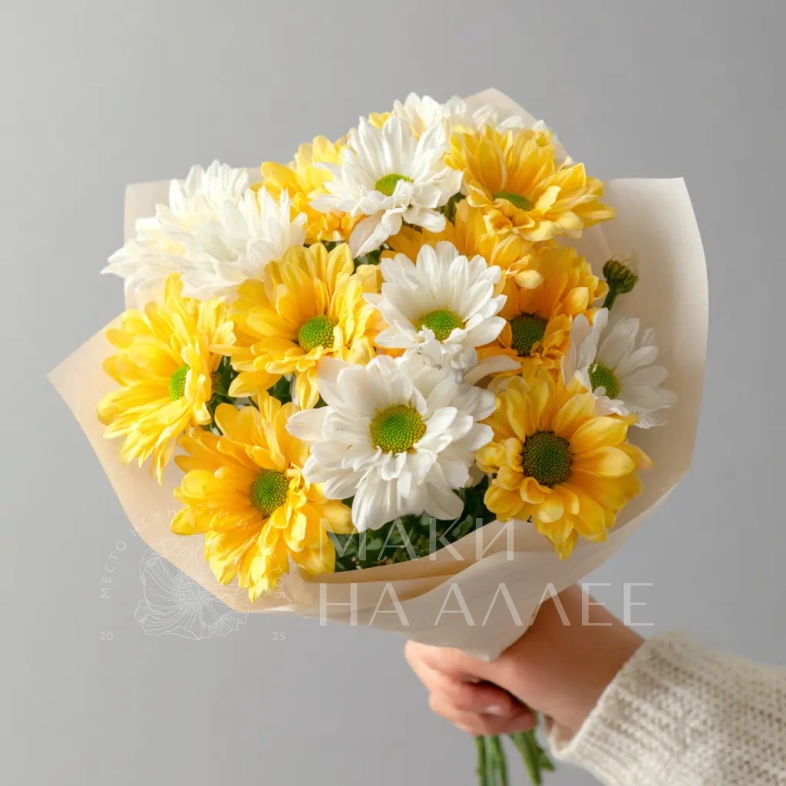 Компактный, но очень выразительный. Хризантемы словно светятся изнутри, превращая небольшой букет в настоящий акцент настроения.