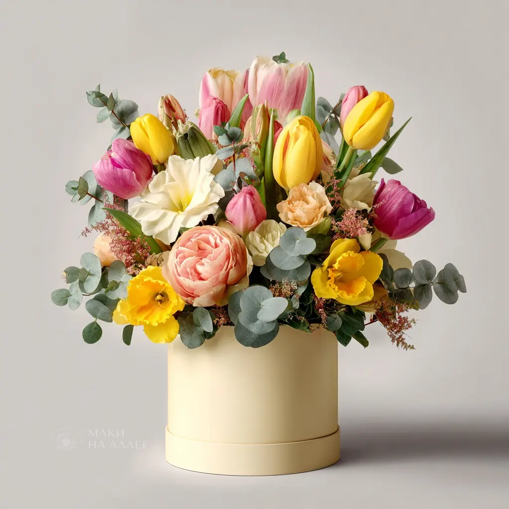 Яркая композиция с тюльпанами, нарциссами, которая наполняет пространство свежестью и радостью весны. Идеально для подарка или украшения.
