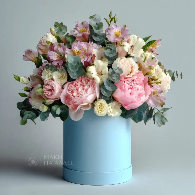 Свежие пионы, альстромерия и эвкалипт создают ощущение летнего утра. Ароматная и легкая композиция для уютных моментов и особых случаев.