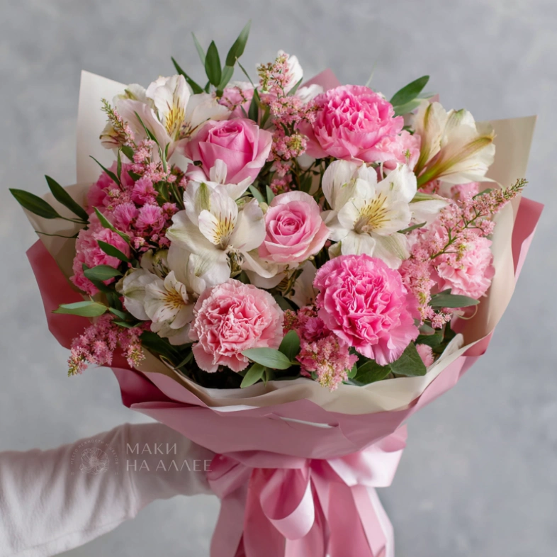 Пушистые розовые гвоздики с зеленью — игривый и романтичный букет для любимой. Идеален для нежных признаний и маленьких сюрпризов, которые хочется запомнить надолго.