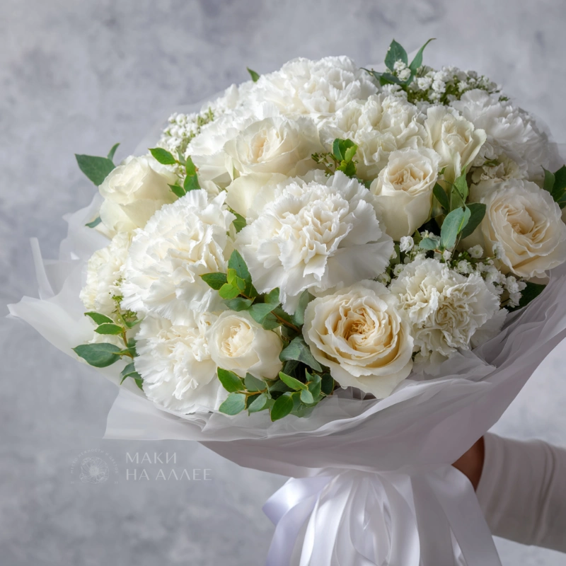 Белые гвоздики в нежной гамме с гипсофилой — лёгкий и воздушный букет, словно танец.Такой букет уместен и на деловой встрече, и как знак внимания человеку, который вам дорог.Возможна замена некоторых позиций в составе букета по согласованию, если цветы временно недоступны из-за сезонности или особенностей поставок.