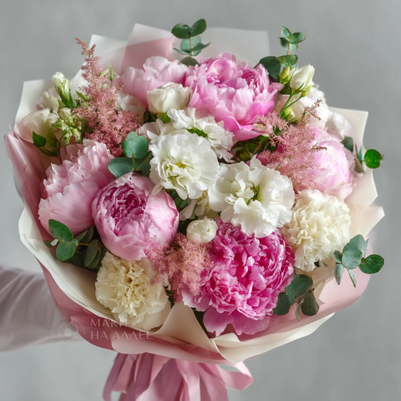 Пудрово-розовая палитра и мягкая текстура делают этот букет особенно трогательным. Пионы создают ощущение уюта, тепла и нежности. Прекрасный выбор для подарка девушке или подруге.