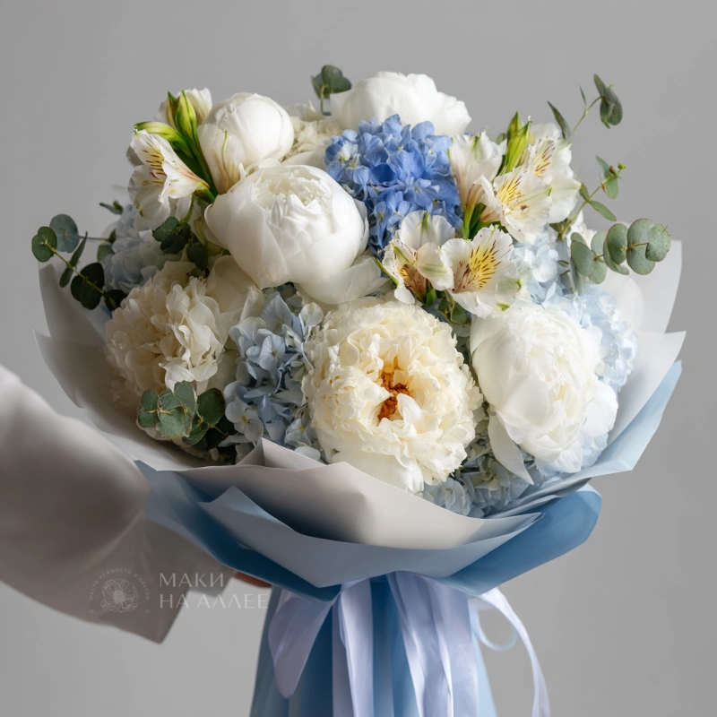 Лёгкий, как воздух, букет из пионов, создающий ощущение полёта и свежести. Универсальный вариант для романтического подарка, знака внимания или дополнения к основному презенту.