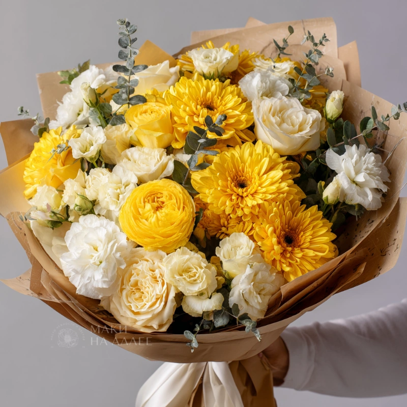 Яркий букет из хризантем в жёлтой и белой гамме — словно лучик солнца в пасмурный день. Он поднимает настроение, наполняет пространство светом и идеально подойдёт для подарка без повода.