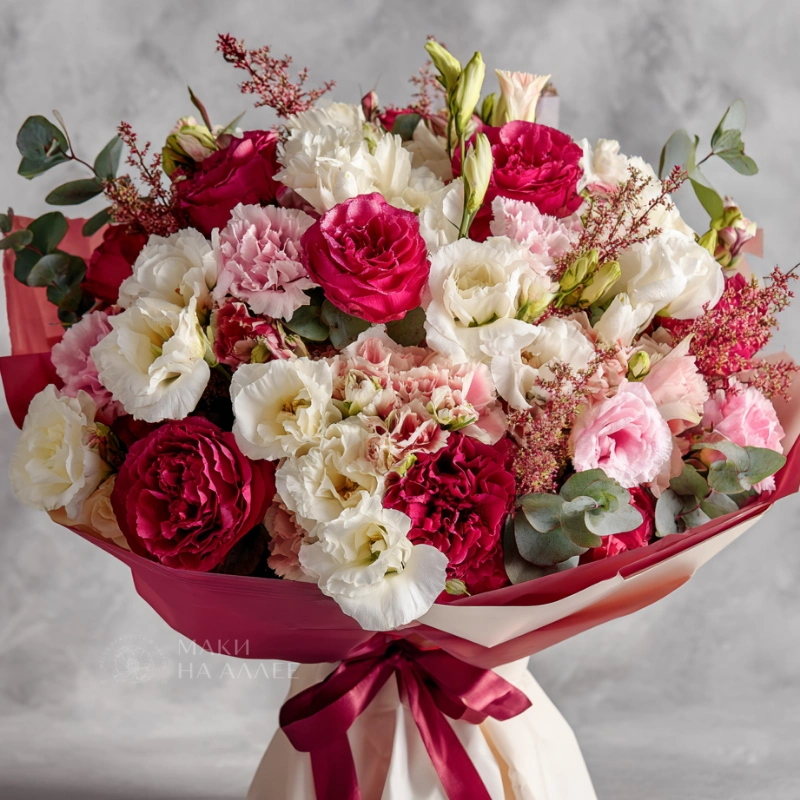 Нежный акцент из изящных бутонов эустомы — свежесть и аромат в каждой детали. Идеально подойдёт для поздравления коллеги, подруги или любимой женщины. Сдержанно, но выразительно.