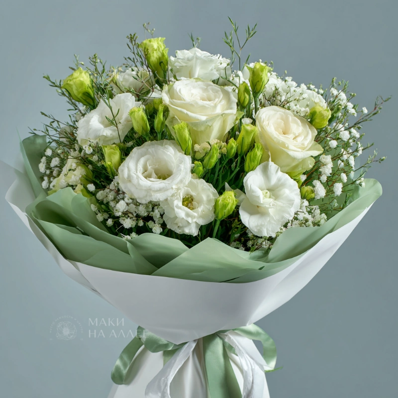 Белоснежная гамма и тонкие стебли — словно звон хрустального ветра. Эустомы придают композиции воздушность и элегантность. Букет, который говорит о любви, уважении и заботе.
