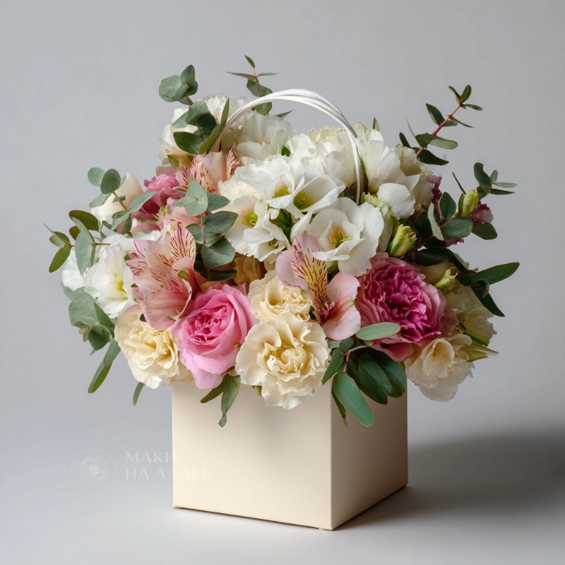 ГлавнаяКаталогКомпозицииВ сумочкахЦветы в сумочке «Прогулка по Парижу»