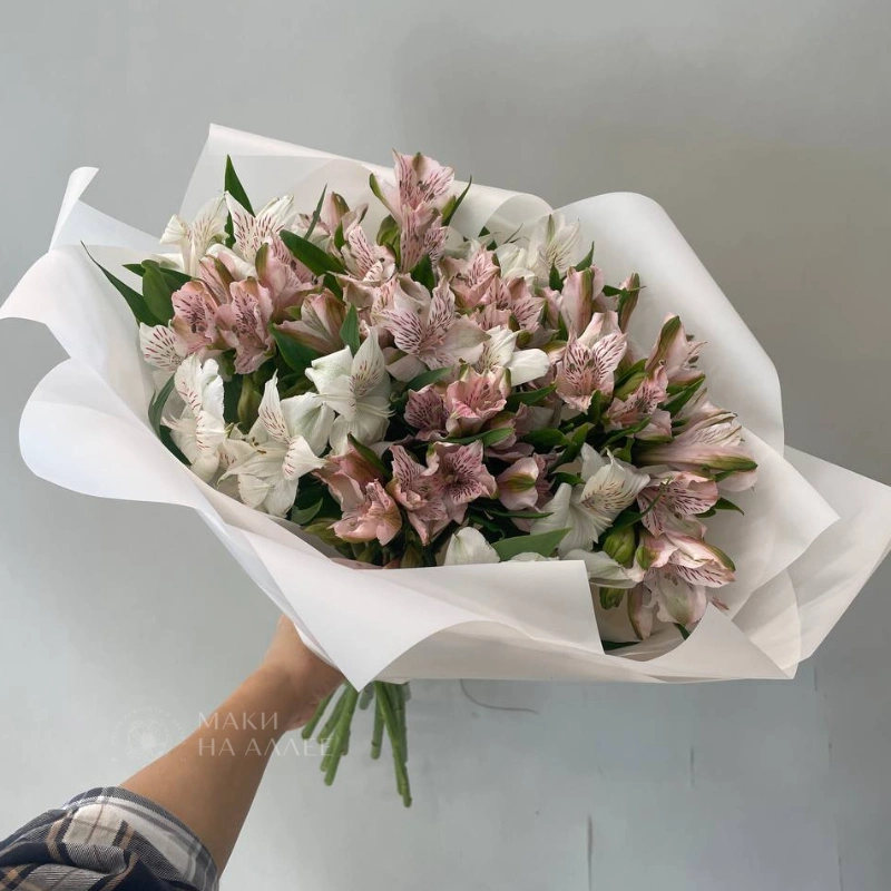 Букет, представленный на изображении, являет собой элегантную композицию из белых и розовых альстромерий, элегантно упакованную в белую бумагу. Альстромерии, также известные своей долговечностью и многообразием оттенков, создают гармоничное сочетание цветов и форм, идеально подходящее для любого торжественного случая. Этот букет станет прекрасным подарком, выражающим нежность и элегантность.