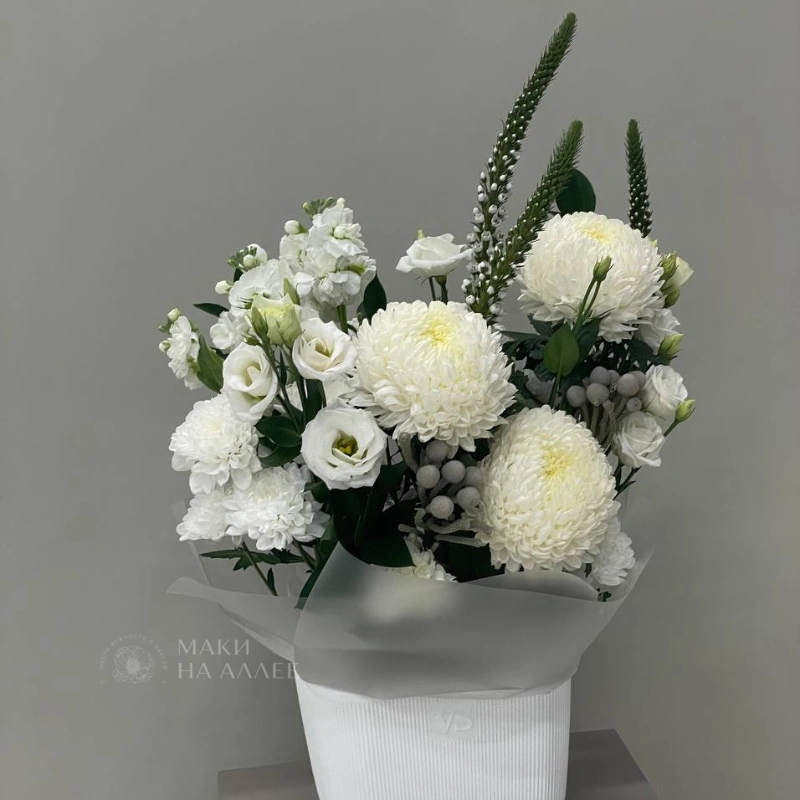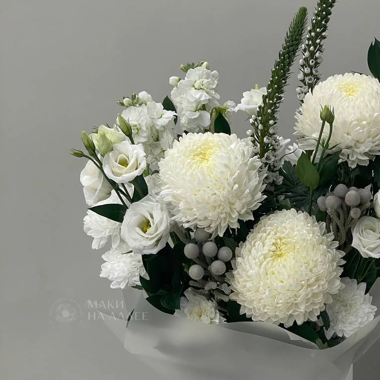 ГлавнаяКаталогКомпозиция с хризантемами эустомой «Зимняя нежность»