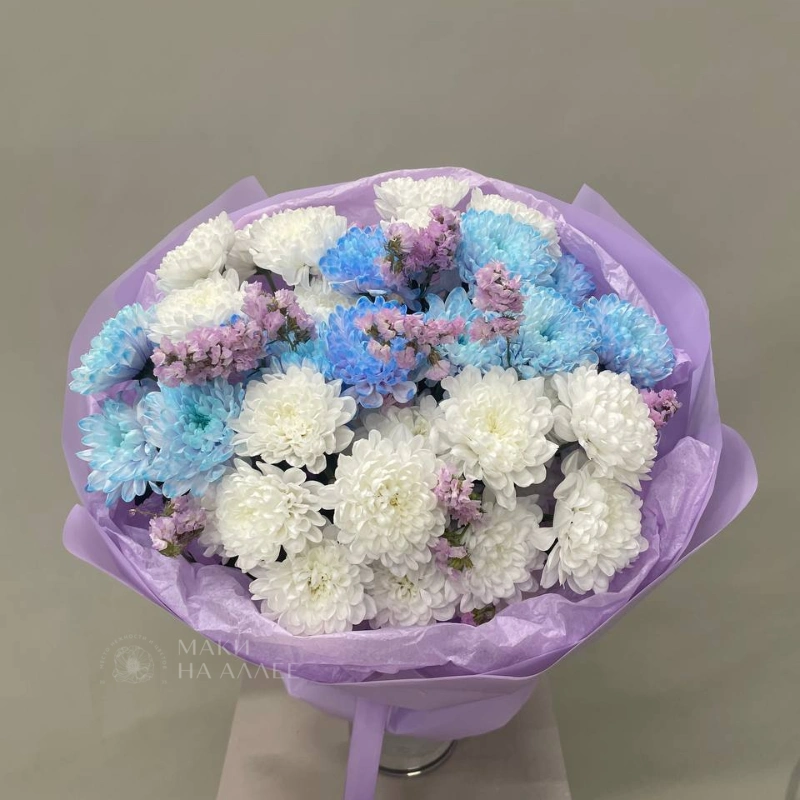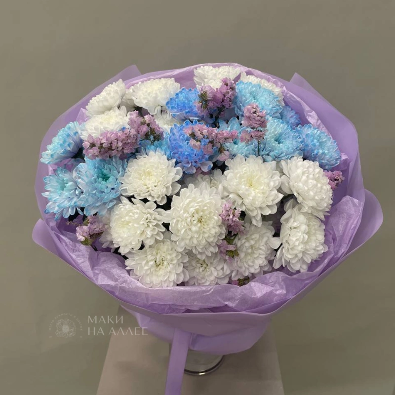 Букет из воздушных хризантем белого, голубого и сиреневого оттенков, дополненный нежными мелкими цветами, создает впечатление легкости и воздушности. Хризантемы, собранные в букет и завернутые в лиловую бумагу с лентой, выглядят очень трогательно и нежно. Такой букет станет прекрасным подарком для близких и друзей.
