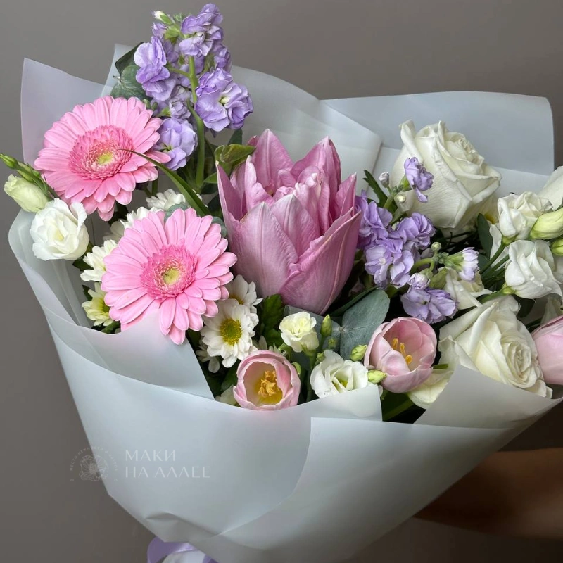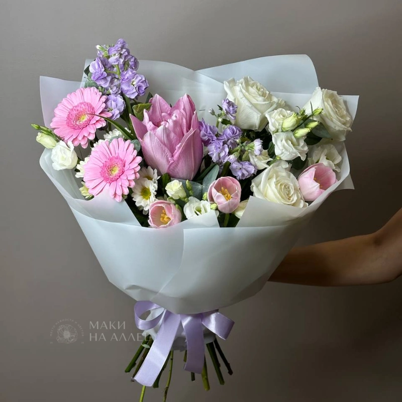 Букет "Нежный сон" - это идеальное сочетание свежести и элегантности. Нежные оттенки розовых и белых цветов, дополненные изящными фиолетовыми акцентами, создают гармоничную композицию, способную привнести тепло и уют в любой интерьер. Этот букет станет прекрасным подарком для близкого человека или украсит любое торжественное событие.