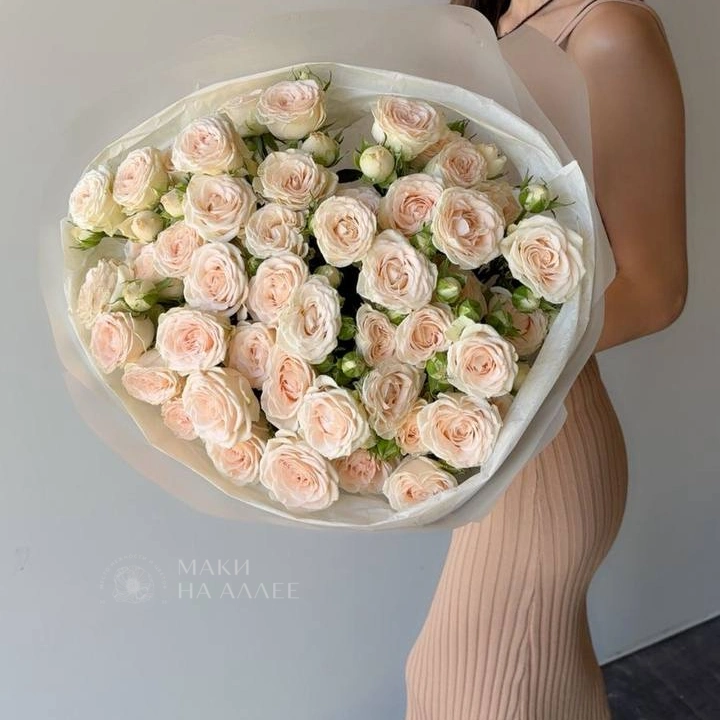 Букет из нежных бледно-розовых роз, элегантно завернутый в белую бумагу. Этот изысканный букет идеально подойдёт для выражения вашей любви и признательности в особый момент.