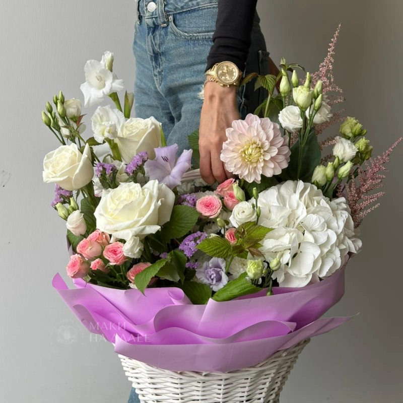 Букет в нежных тонах с белыми розами, бледно-розовыми гвоздиками, лилиями и пушистыми веточками смотрится воздушно и трогательно. Необычная форма и цветовое решение притягивают взгляд и вызывают восхищение. Этот букет станет прекрасным подарком для близкого человека.