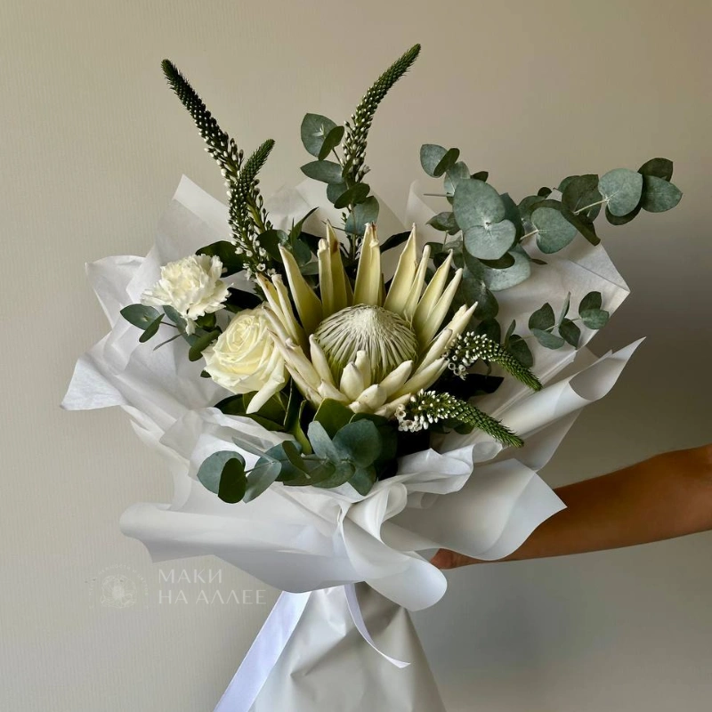 Описание букета Этот элегантный букет, выдержанный в нежных белых оттенках, создает атмосферу утонченности и спокойствия. В его основе королевская протея, окруженная белыми розами и гвоздиками, дополненная изящными веточками эвкалипта и другими зелёными акцентами. Букет идеально подойдёт для особого случая, выражая нежность и безупречный вкус