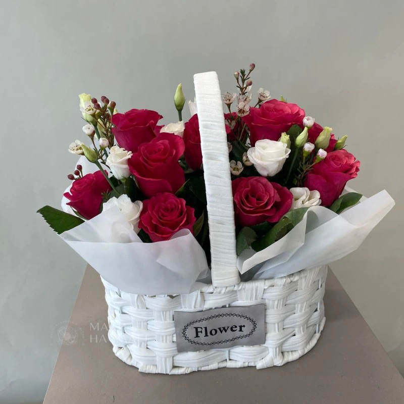 Букет в корзине, наполненный нежными розовыми и белыми цветами, создает трогательный и романтический образ. Нежные лепестки роз и лизиантусов гармонично сочетаются с веточками цветущих деревьев, добавляя композиции свежесть и природную красоту. Этот букет станет прекрасным подарком для самых дорогих и близких.