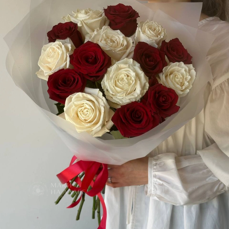 Букет из нежных белых и страстных красных роз - идеальный подарок для самых значимых моментов. Сочетание классических оттенков символизирует любовь и чистоту, создавая яркий и запоминающийся образ.