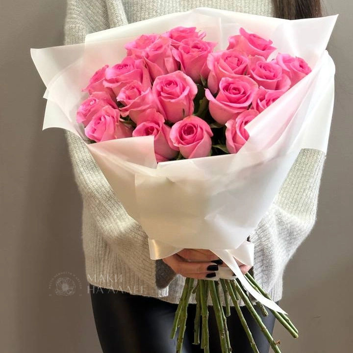 Этот букет представляет собой изящную композицию из розовых роз, элегантно упакованную в белую бумагу. Нежные оттенки роз создают романтичную и трогательную атмосферу, делая букет идеальным выбором для выражения чувств. Розы в букете свежие и яркие, их розовый цвет символизирует любовь, признательность и восхищение