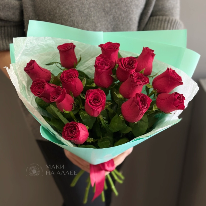 Букет из 11 роскошных бардовых роз, элегантно упакованный в мягкую голубую бумагу и дополненный нежной розовой лентой. Этот классический букет станет прекрасным выражением любви и внимания. Идеальный выбор для любого торжественного случая.