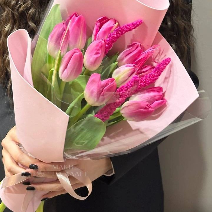 Букет, состоящий из нежных розовых тюльпанов и ярких розовых перьев лисохвоста, станет прекрасным подарком для любой женщины. Необычное сочетание тюльпанов с оригинальным цветком-пером лисохвоста создает образ трогательной женственности и воздушной лёгкости. Букет, завёрнутый в красивую светло-розовую упаковку, выглядит очень эстетично и гармонично.