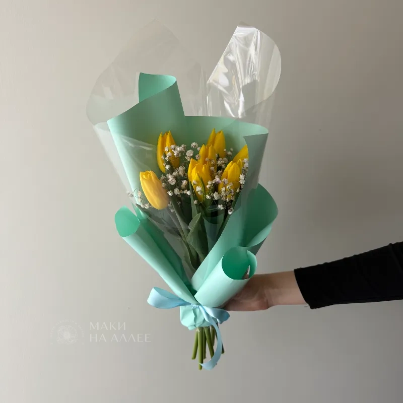 Описание букета: Нежный и солнечный букет, состоящий из свежих желтых тюльпанов, дополненный воздушной гипсофилой. Букет красиво упакован в бирюзовую бумагу с атласным бантом голубого оттенка, что придаёт ему особенно праздничный вид. Этот букет станет ярким акцентом в интерьере и поднимет настроение в любой день.