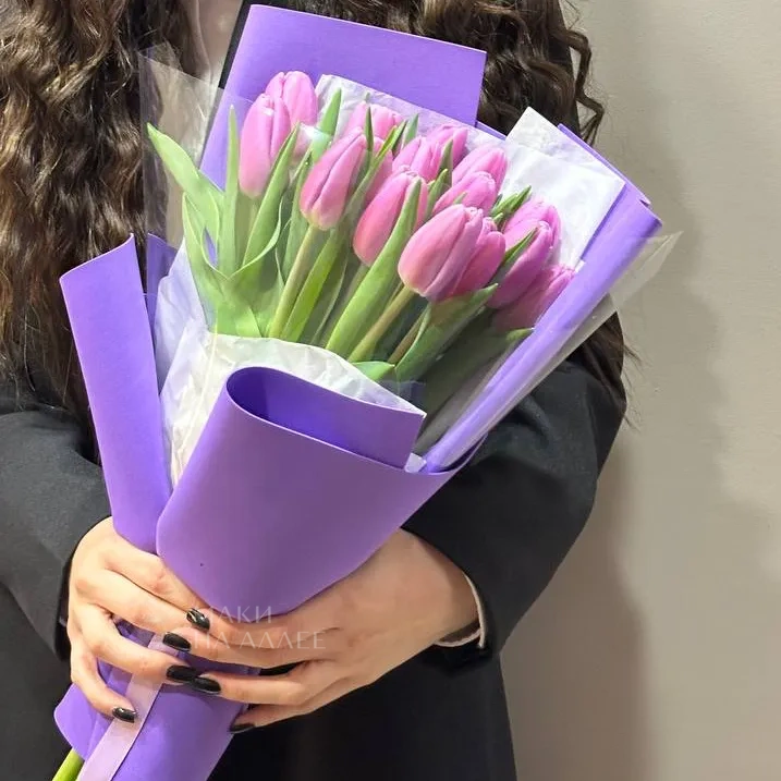 Букет из 11 свежих розовых тюльпанов, элегантно упакованный в лиловую бумагу и перехваченный нежной лентой, станет прекрасным подарком для самых дорогих людей. Нежные бутоны и яркий цвет этих весенних цветов создадут атмосферу радости и уюта. Букет станет отличным выражением любви и признательности в любой ситуации.