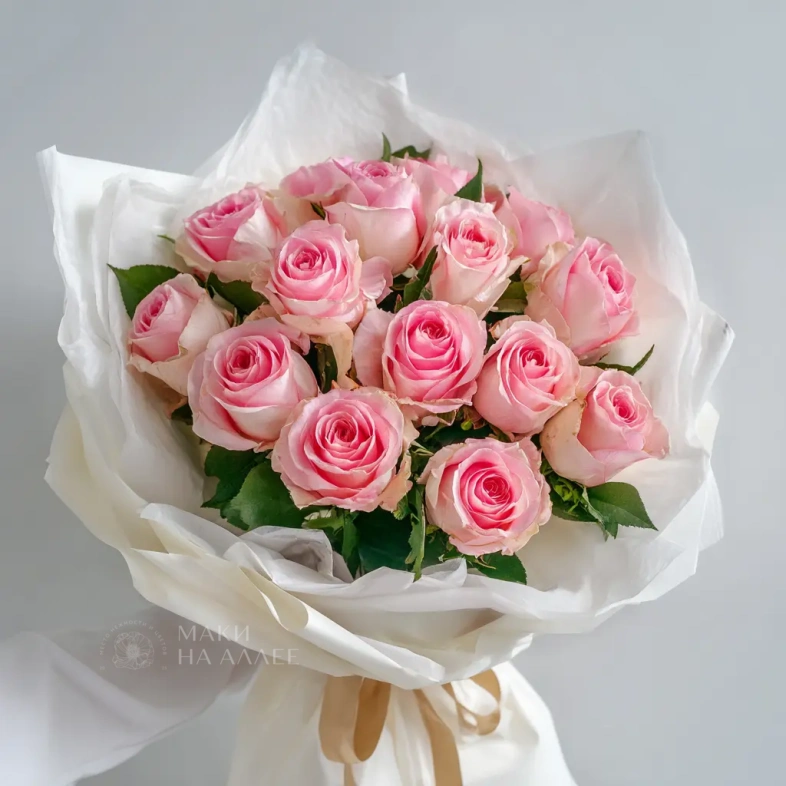 Элегантный букет из 15 розовых роз с крупными бутонами. Эквадорские сорта славятся своей стойкостью и внешним видом — подарите утончённость и заботу в одном букете.